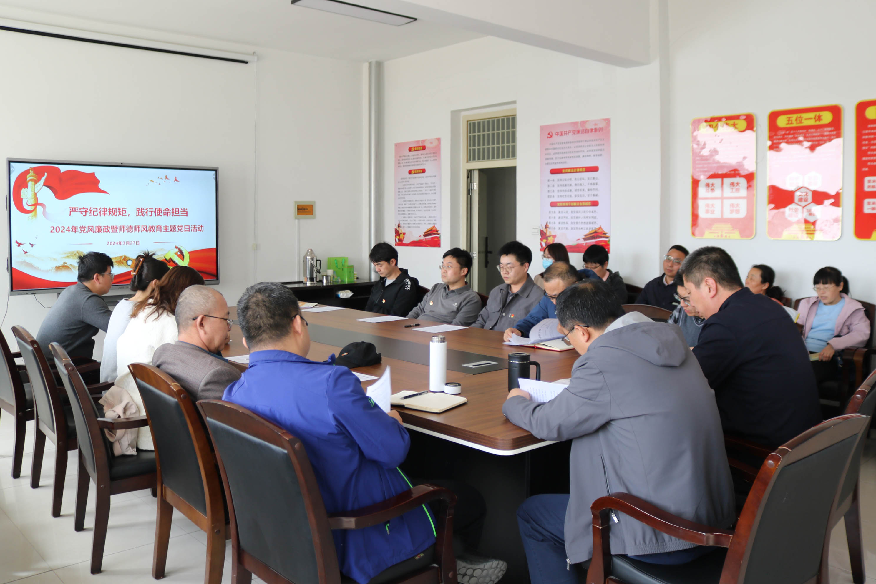 主题党日活动中,全体党员集中组织观看廉政警示教育片《迷惘之省》——宁夏回族自治区区管领导干部违纪违法案件警示录。通过违纪违法真实典型案例警示和教育全体党员教师,强化廉洁自律意识,筑牢拒腐防变思想防线,增强党风廉政建设的思想自觉政治自觉和行动自觉。