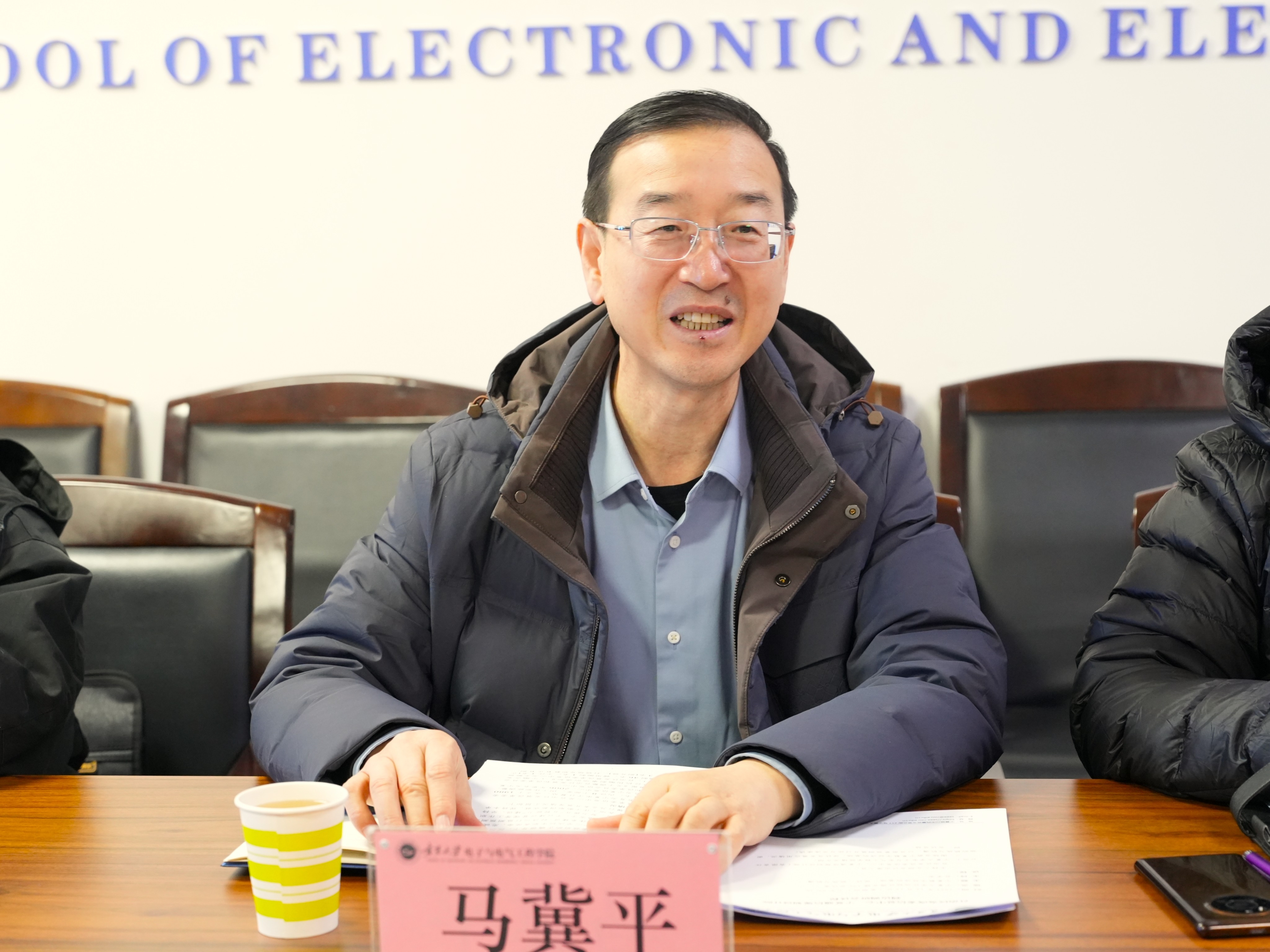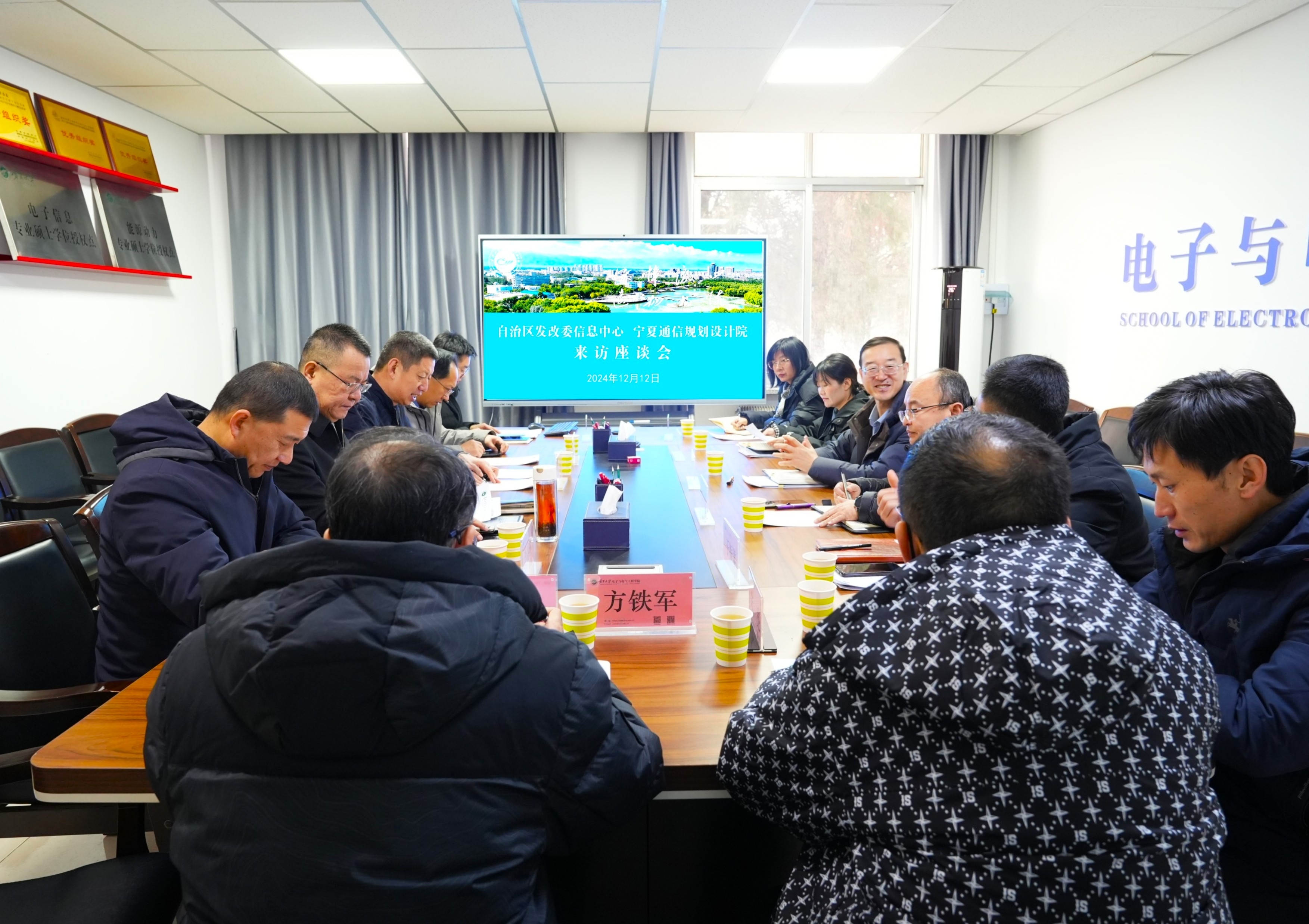 【电院讯 刘洋/文、图】12月12日,自治区发改委信息中心主任马冀平、宁夏通信规划设计院副院长于振洋一行来到我院,在怀远校区德言楼106会议室召开座谈会就“宁夏数字经济的基础、现状、挑战和机遇”开展调研,学院党总支书记何彦平,副院长郭中华、李春树及青年教师代表参加座谈会。会议由院长孙学宏主持。