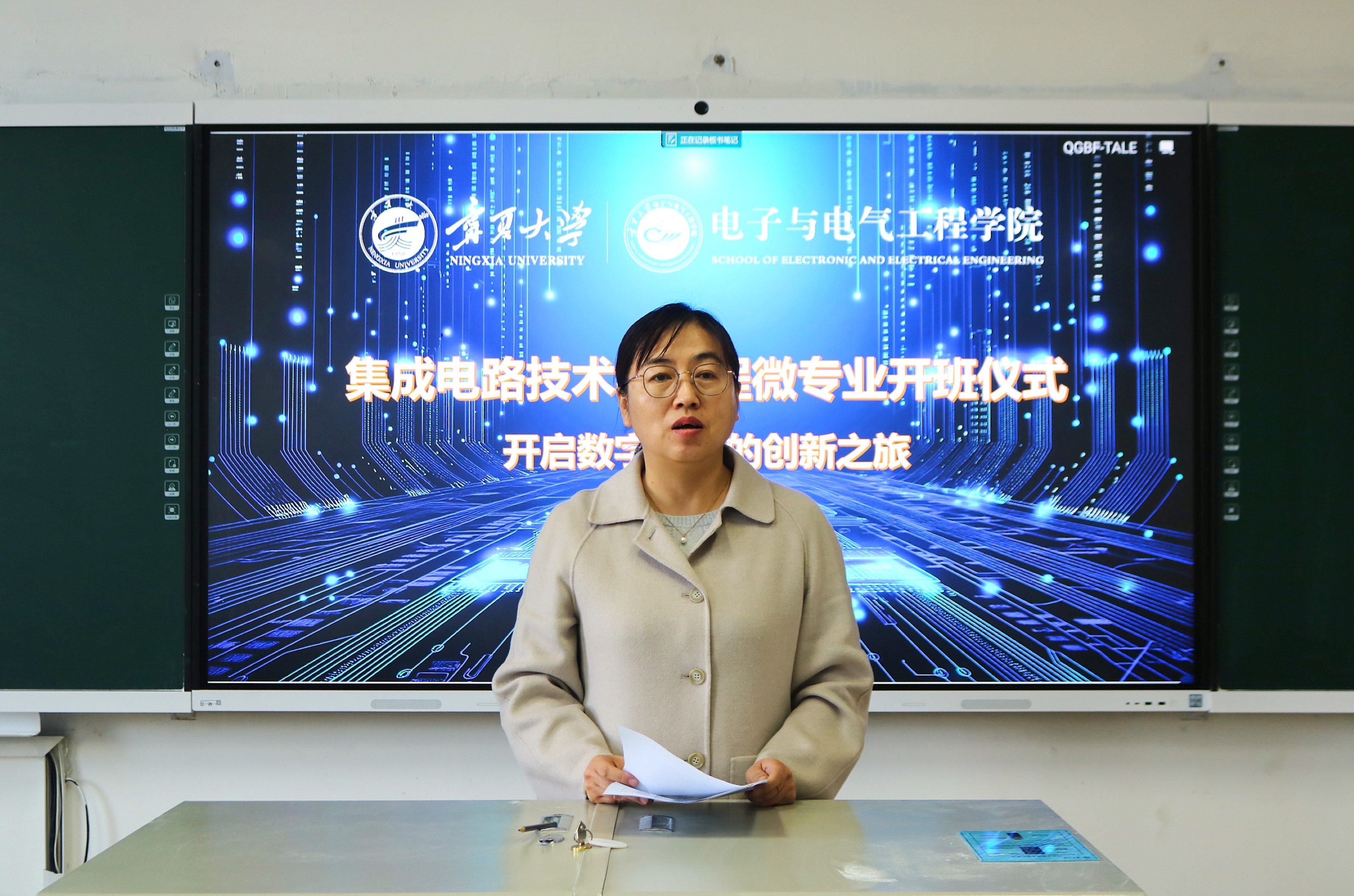 开班仪式上,学院党总支书记何彦平向首届集成电路技术与工程微专业班主任杨向红颁发班主任聘书。