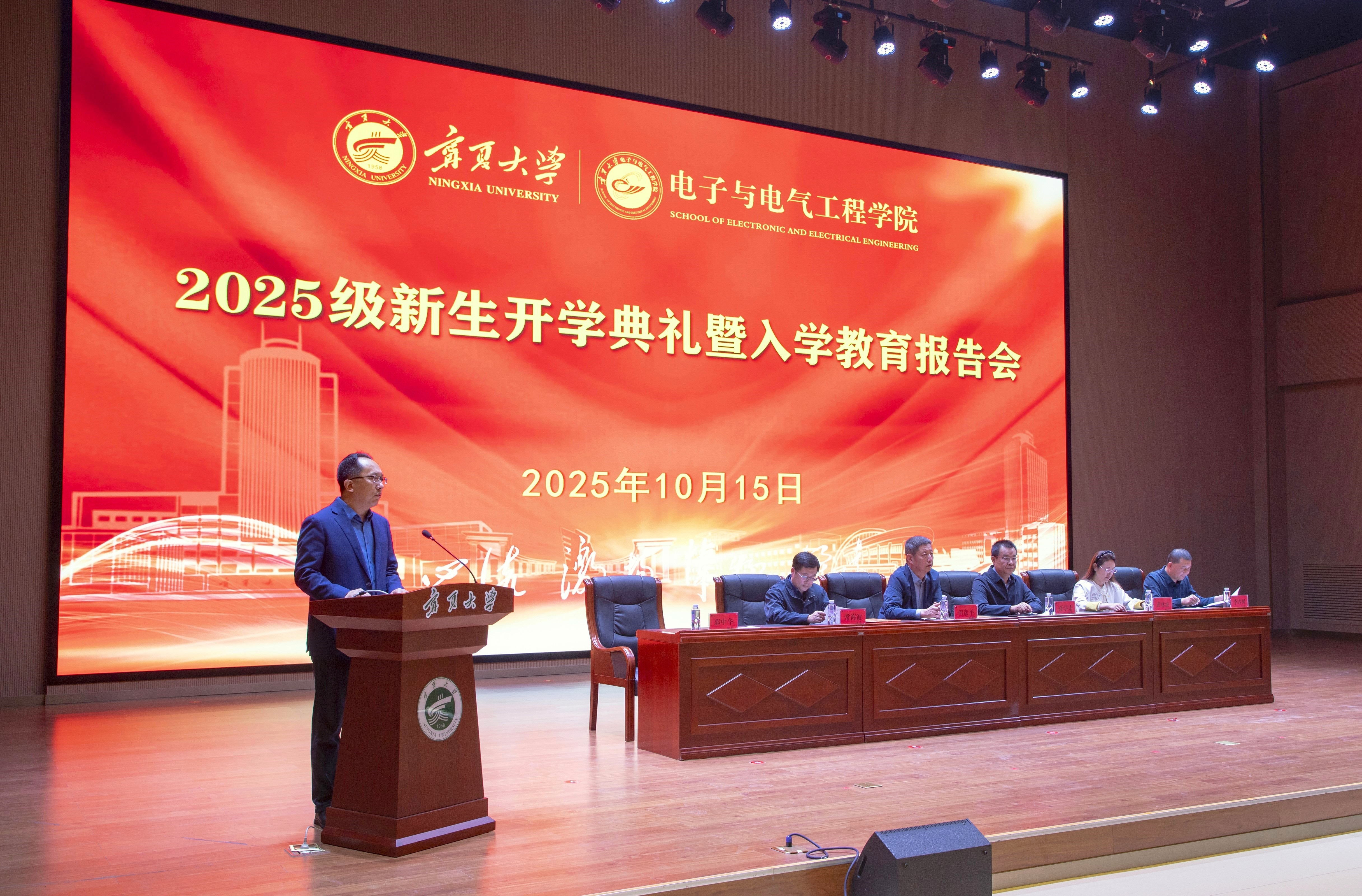 【电院讯 李苗苗/文 陈帅仰、焦浩展/图】秋风送爽,杏坛迎新。10月15日,我院在贺兰山校区笃行楼一楼报告厅举行2025级新生开学典礼暨入学教育报告会。来自全国各地的259名新生齐聚贺兰山麓,以电路为舟、代码为桨,正式开启在电子与电气工程学院的求知新征程。典礼特邀区内外电子、通信、电力等行业企业代表及优秀校友共同见证,会议由学院副院长郭中华主持。
