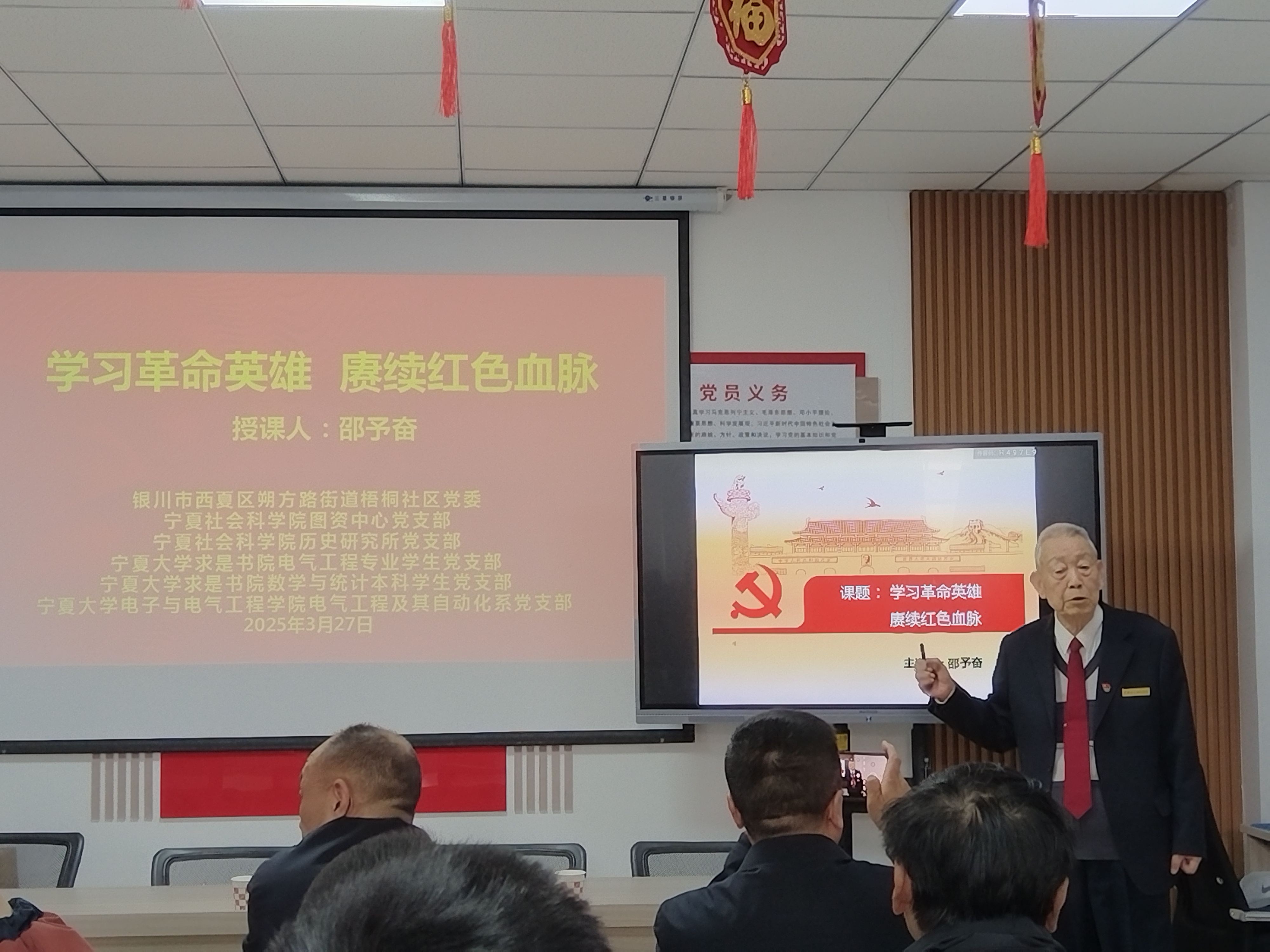 宁夏大学关工委宣讲团成员、老党员邵予奋老师以“学习革命英雄 赓续红色血脉”为题,围绕“革命英雄王若飞的故事”“革命英雄吉鸿昌的故事”“革命英雄朱瑞的故事”“怎样向革命英雄学习”等内容,讲述了一段段动人心魄的红色故事,彰显了老一辈无产阶级革命家和革命先辈前赴后继的爱国主义精神和爱党爱国的心路历程。