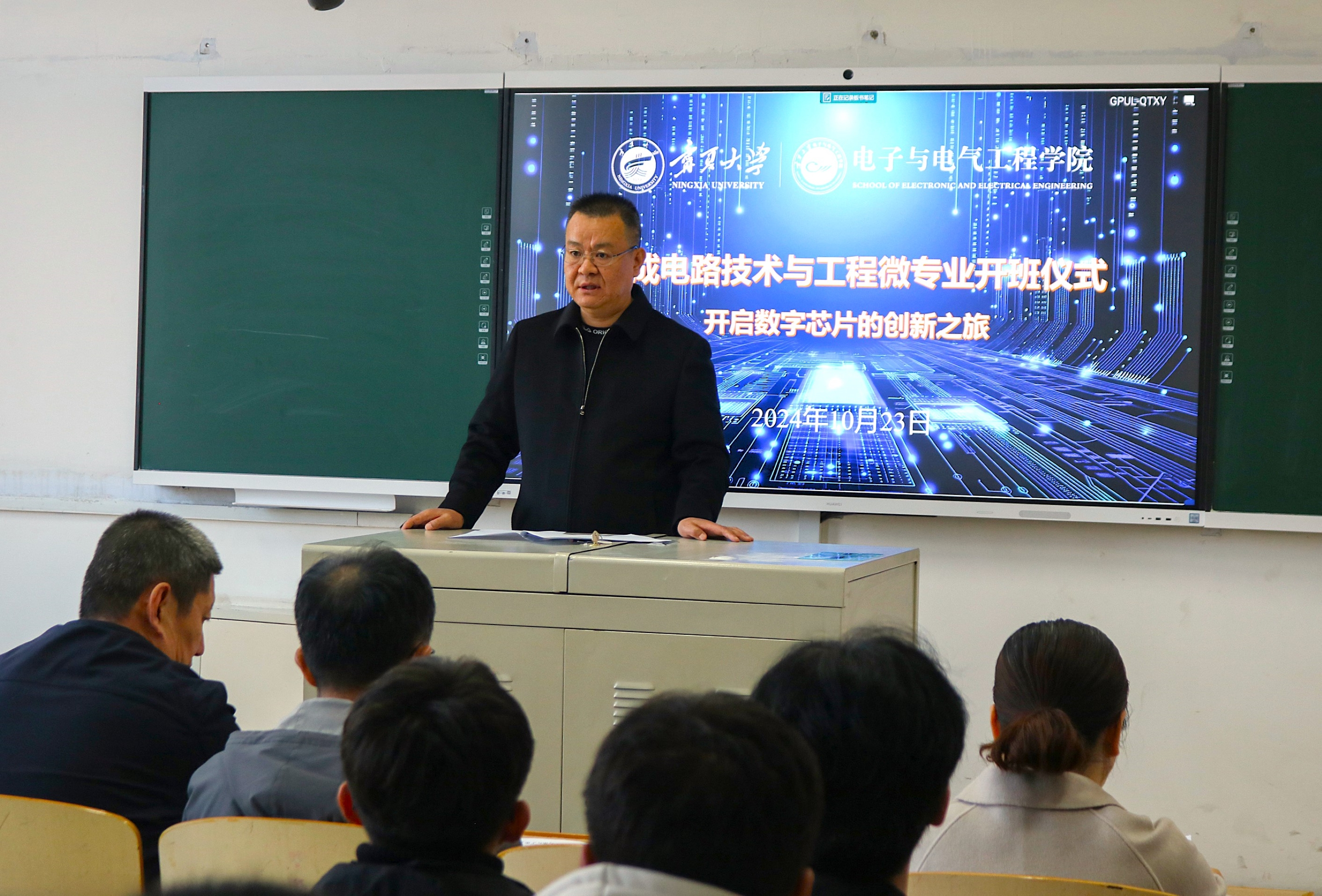 孙学宏对首批加入集成电路技术与工程微专业的同学们表示热烈欢迎。他详细介绍了集成电路技术与工程微专业的背景、课程设置、教学特色以及培养目标。他讲到,微专业的开设是为了更好地适应当前半导体芯片高新技术发展需求,旨在培养有志于在集成电路设计与制造等领域从事技术开发、工程应用与生产管理的创新应用型人才,通过学习不仅能够加速知识的更新、优化知识结构、拓宽视野,而且能够提升自我、为未来创造更多的就业机遇。他希望首届微专业同学要树立信心,紧跟授课老师教学目标和要求,通过有计划、有节奏的学习,顺利完成学业,为自己的未来铺就坚实的道路。