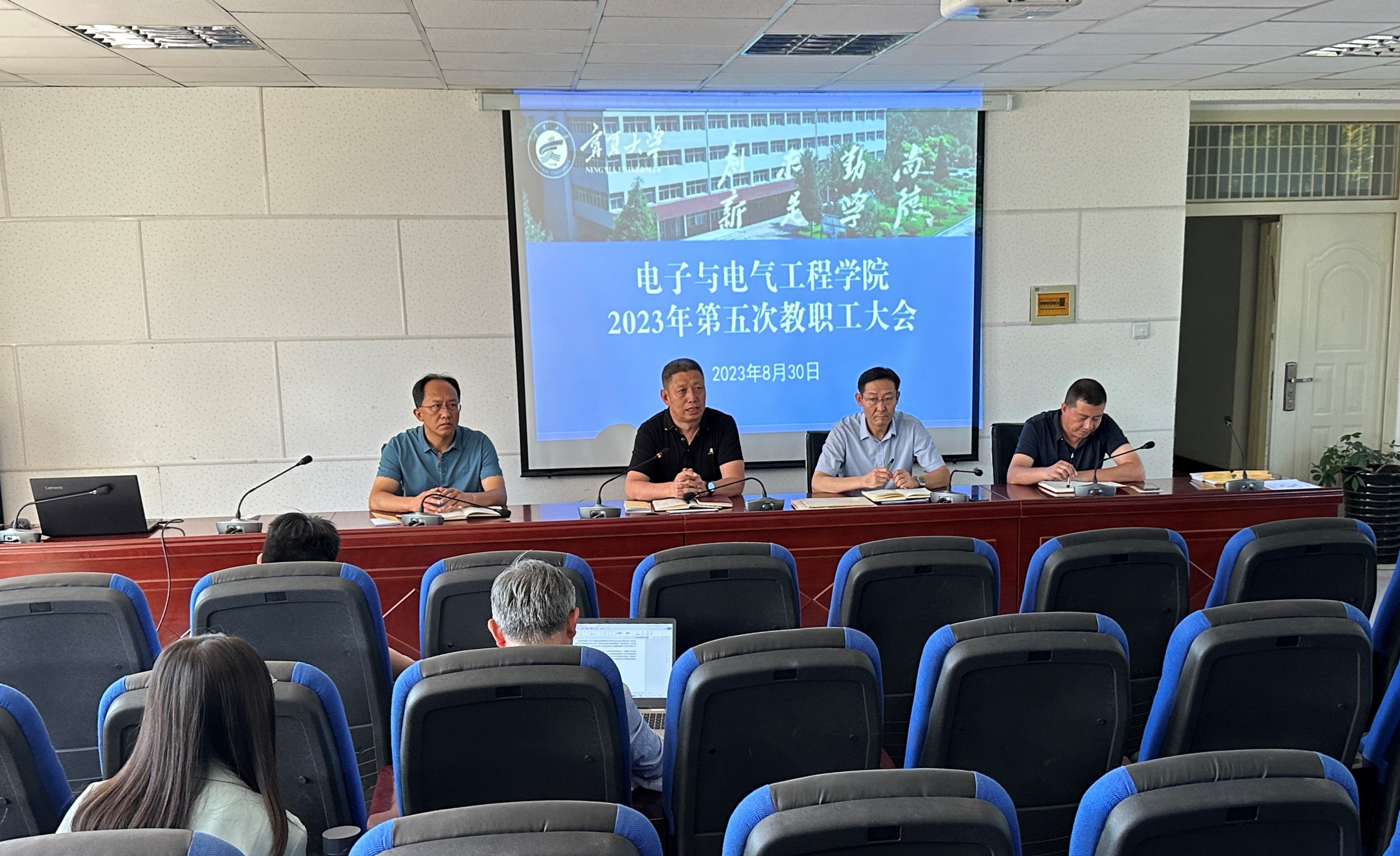 【电院讯 万艳妮/文 刘心仪/图】8月30日,我院在怀远校区博远楼召开第五次全院教职工大会暨新学期工作部署会,通报学院暑期相关工作进展情况,并对新学期工作进行部署安排。会议由学院党总支书记何彦平主持。