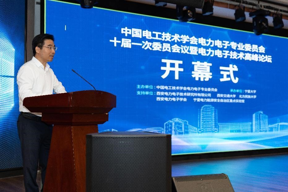 中国电工技术学会组织人事部主任王振涛和李学斌为开幕式致辞。李学斌在致辞中代表学校对会议的召开表示祝贺,对来自各地电力电子领域的专家学者表示欢迎。他介绍了宁夏大学的历史、发展与改革现状,期待与会专家为宁夏大学专业建设与学科发展和宁夏地区能源电力行业的发展建言献策,助力宁夏大学高质量发展。