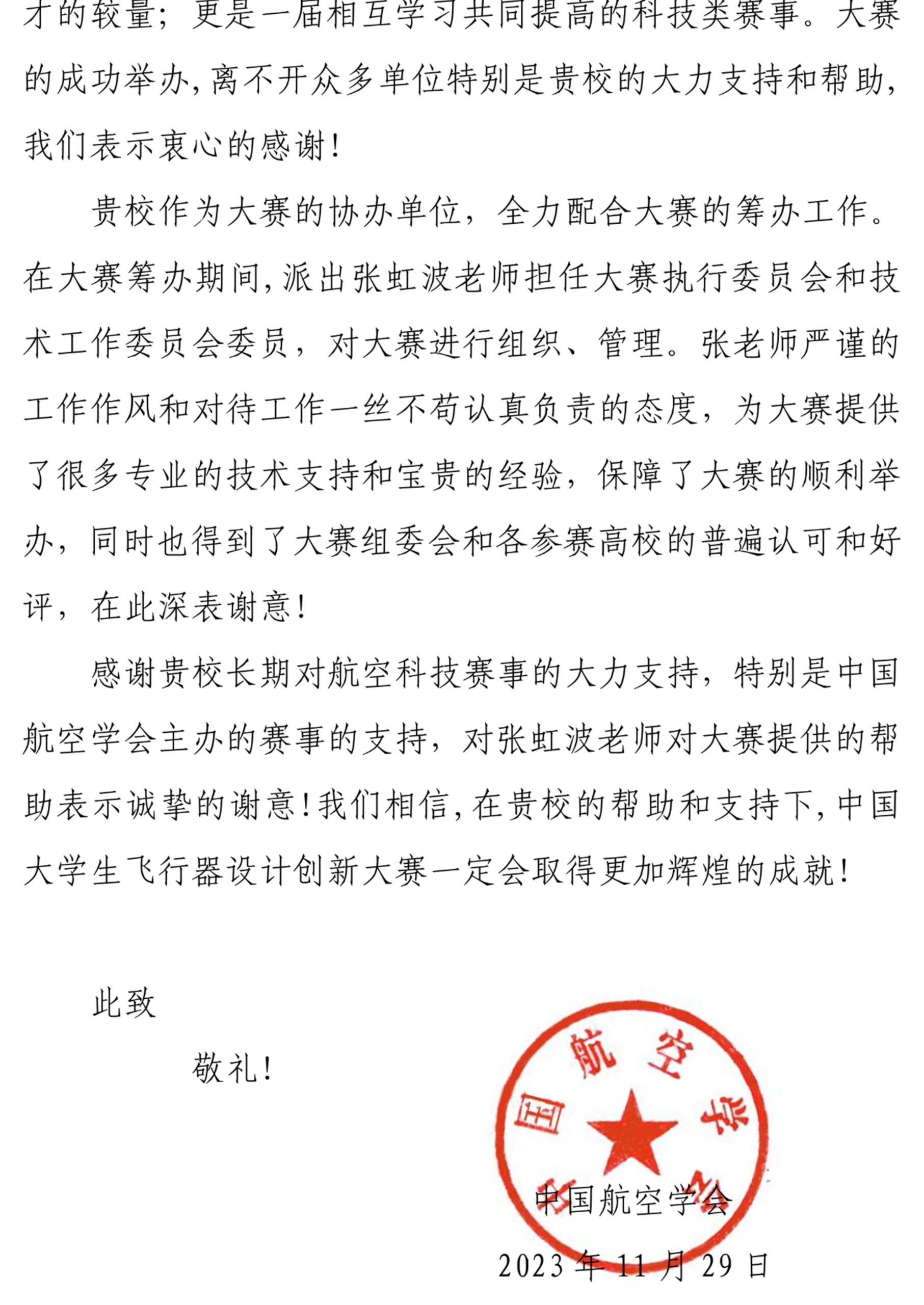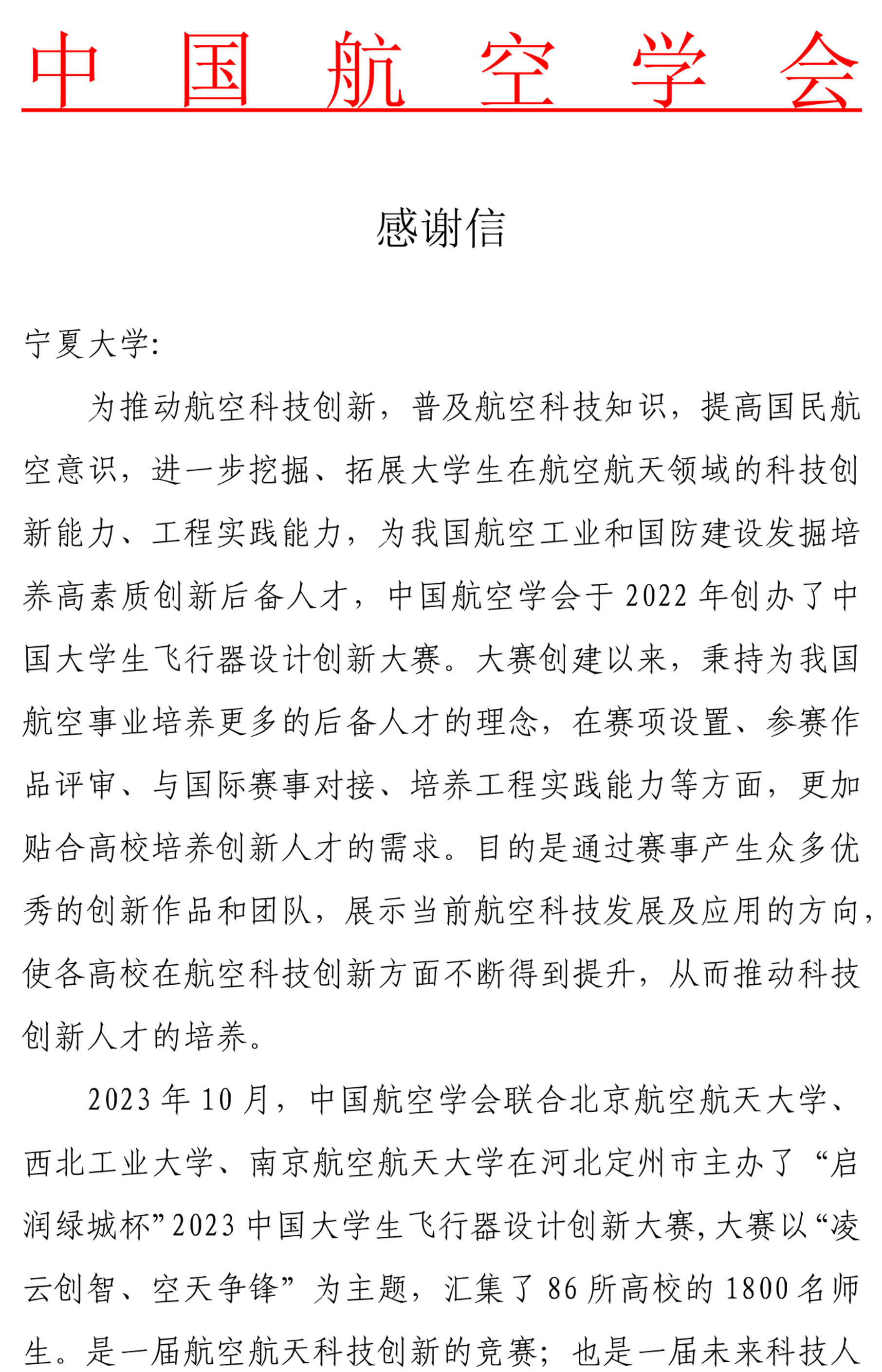 【电院讯 万艳妮/文、图】近日,中国航空学会向宁夏大学发来感谢信。对我校长期以来支持和帮助对中国航空学会主办的航空科技赛事表示衷心感谢,对我校张虹波老师对大赛提供的专业技术支持和宝贵经验表示诚挚谢意。