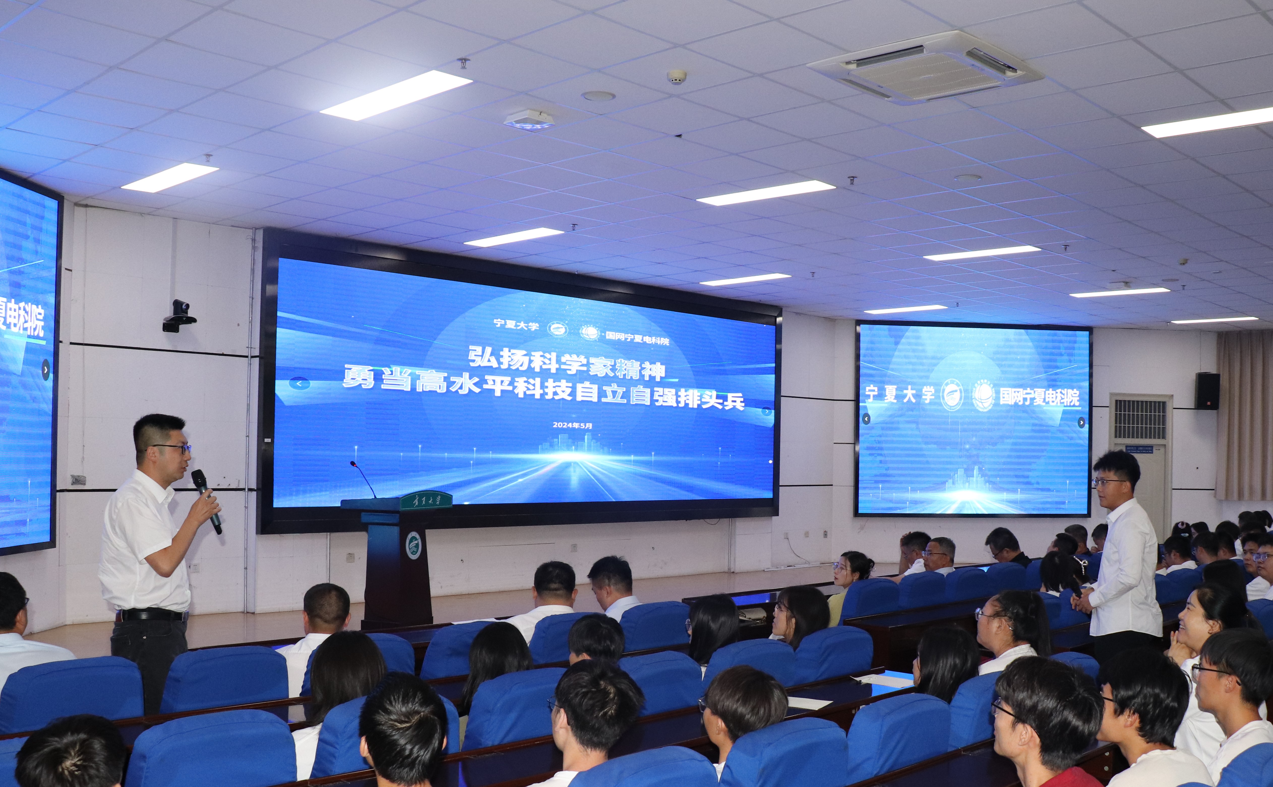 【电院讯 杨国华/文 韩腾/图】为全面宣传以习近平同志为核心的党中央对广大科技者的亲切关怀和对科技工作的高度重视,生动展示科技工作者风采,弘扬科学家精神,营造全社会支持科技事业、爱护科技人才的氛围,在第八个全国科技工作者日到来之际,我院与国网宁夏电力科学研究院于5月28日在宁夏大学贺兰山校区文荟楼联合开展“弘扬科学家精神 勇当高水平科技自立自强排头兵”主题活动。电科院党委书记、副院长王翔,副院长夏绪卫,我院党总支书记何彦平,院长孙学宏一并出席活动。
