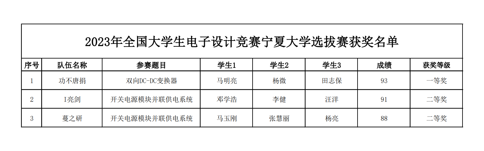 根据《2023年全国大学生电子设计竞赛宁夏大学选拔赛的通知》,我院于6月20日组织开展了校级选拔赛的评审工作。在广大师生的热情参与下,全校共有24件作品参加比赛,其中3件作品获得校级奖励。现将获奖结果进行公示。