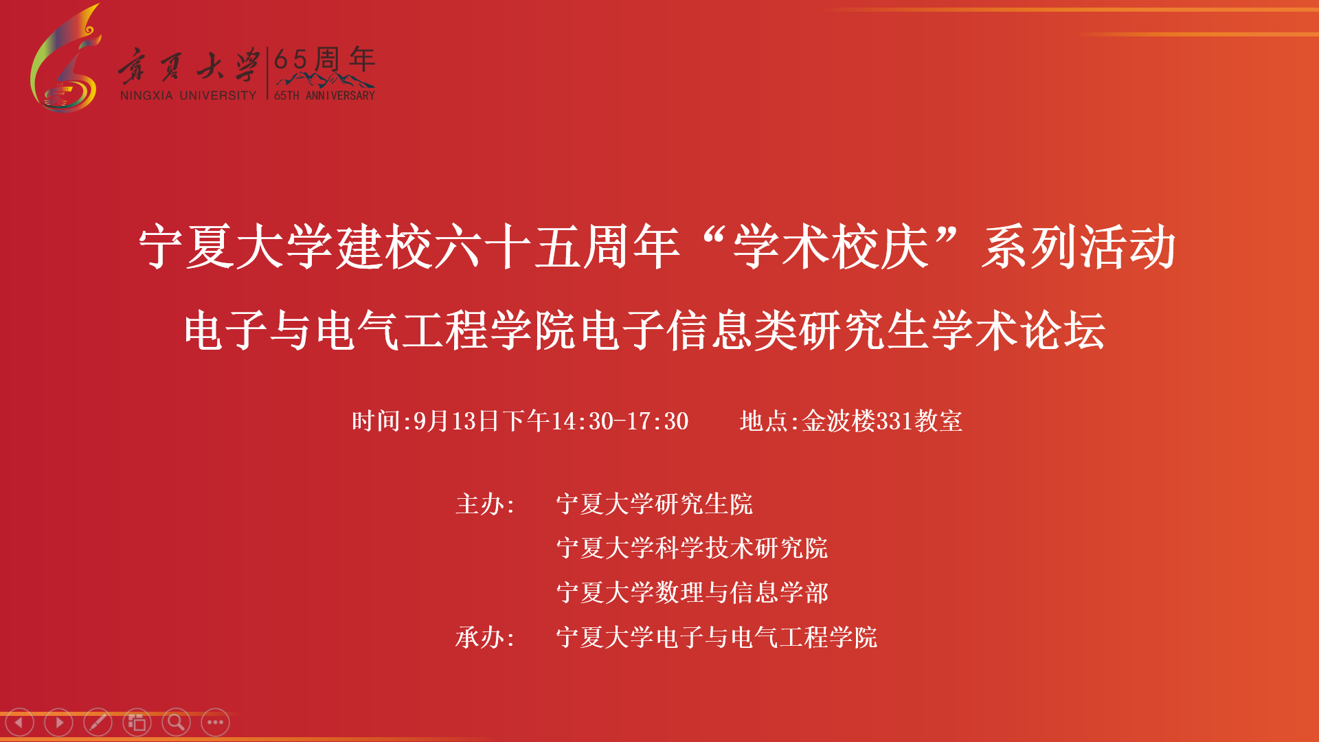 【电院讯 杨国华/文 张开智/图】9月13日下午,我院承办的宁夏大学建校65周年“学术校庆”系列活动之电子信息类研究生学术论坛在怀远校区金波楼331室开幕,北方民族大学韦海成教授、国网宁夏电力银川供电公司杨涌涛正高职高级工程师、北方民族大学张白副教授、我院郭中华教授、杨国华教授应邀担任评委,学术论坛开幕式由我院电子信息学位点负责人杨国华主持。